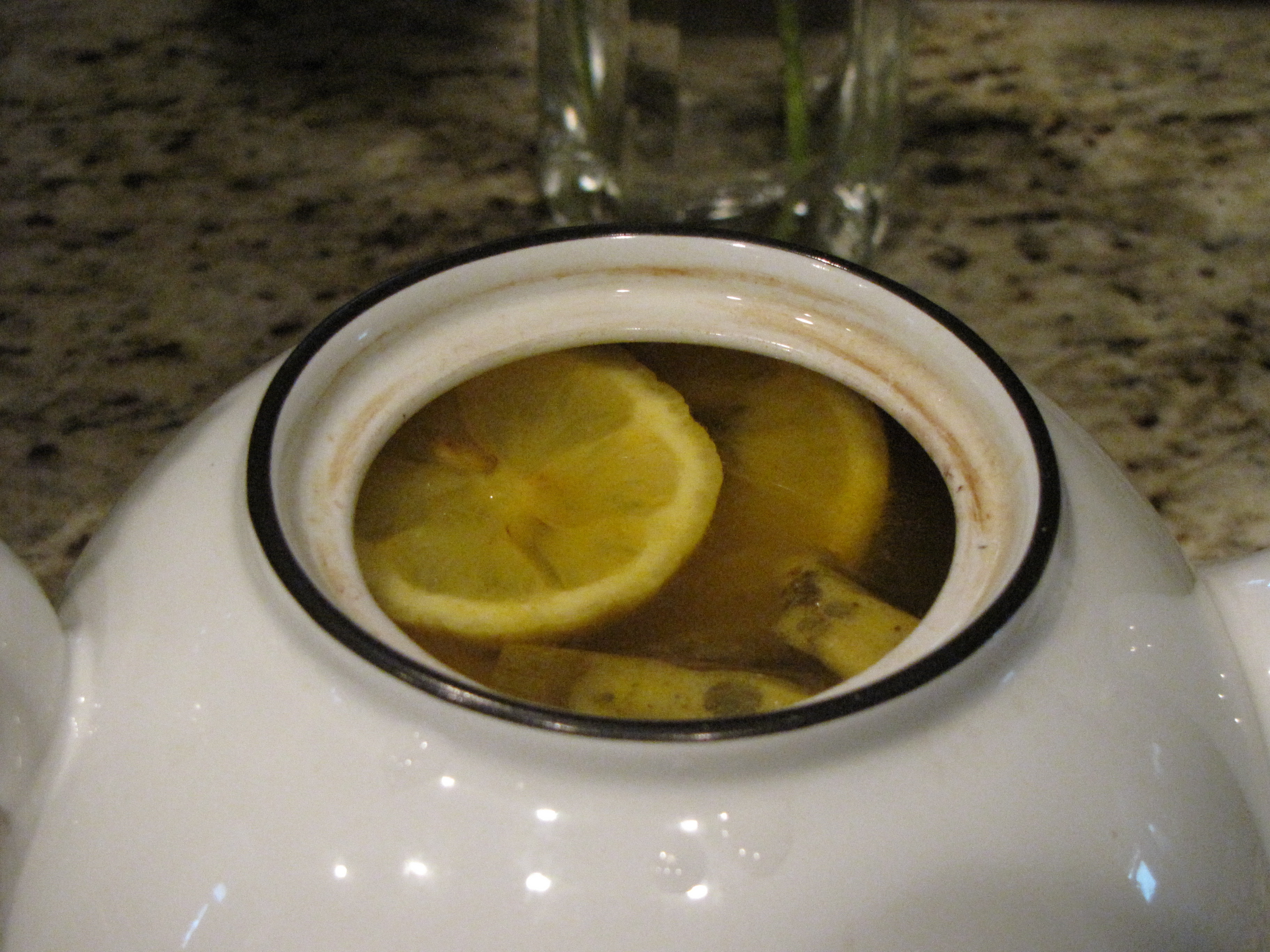 Over the Canadian Thanksgiving weekend we went for a hike before going to a big dinner at my parent’s house. So after climbing up to look at two different view points in the park and then eating a big meal I knew it was time for one of my special tea brews! I decided to make a ginger, turmeric and lemon concoction. I start with a black tea base and in this case I use a tea bag instead of loose leaf because I am not drinking the tea for any specific characteristic, it’s there to blend with what ever I decide to put in the pot. If I was just having tea I would rarely drink tea bag tea because the pieces of tea in the bag are chopped up so small the tea has lost all its original qualities, yes, it’s still tea but its the tail-end of the manufacturing process and is often nothing more than the sweepings off the factory floor. But, with this said, there are some good quality tea bagged tea you just have to try different brands, most of the tea in the world is consumed from tea bags.