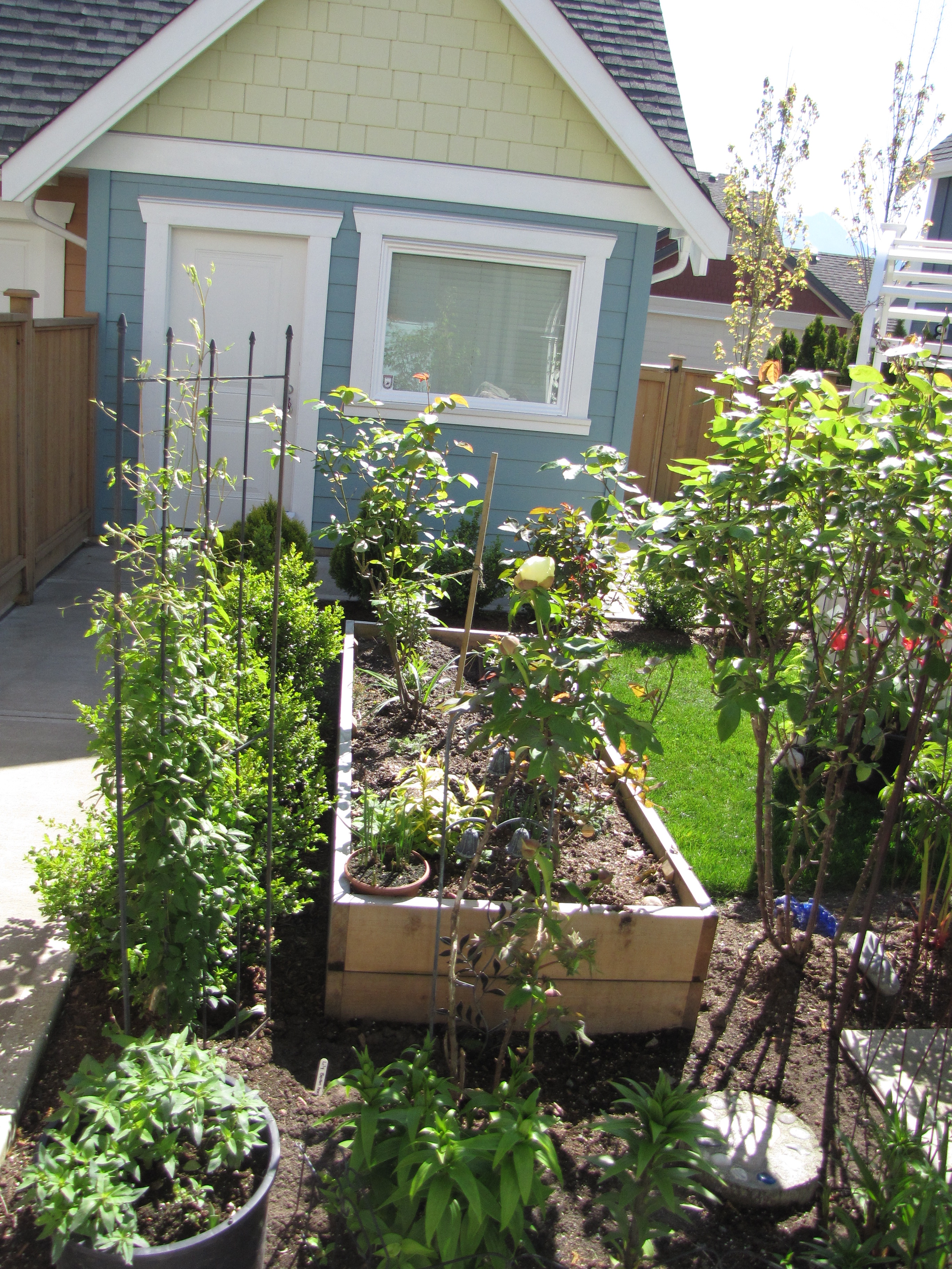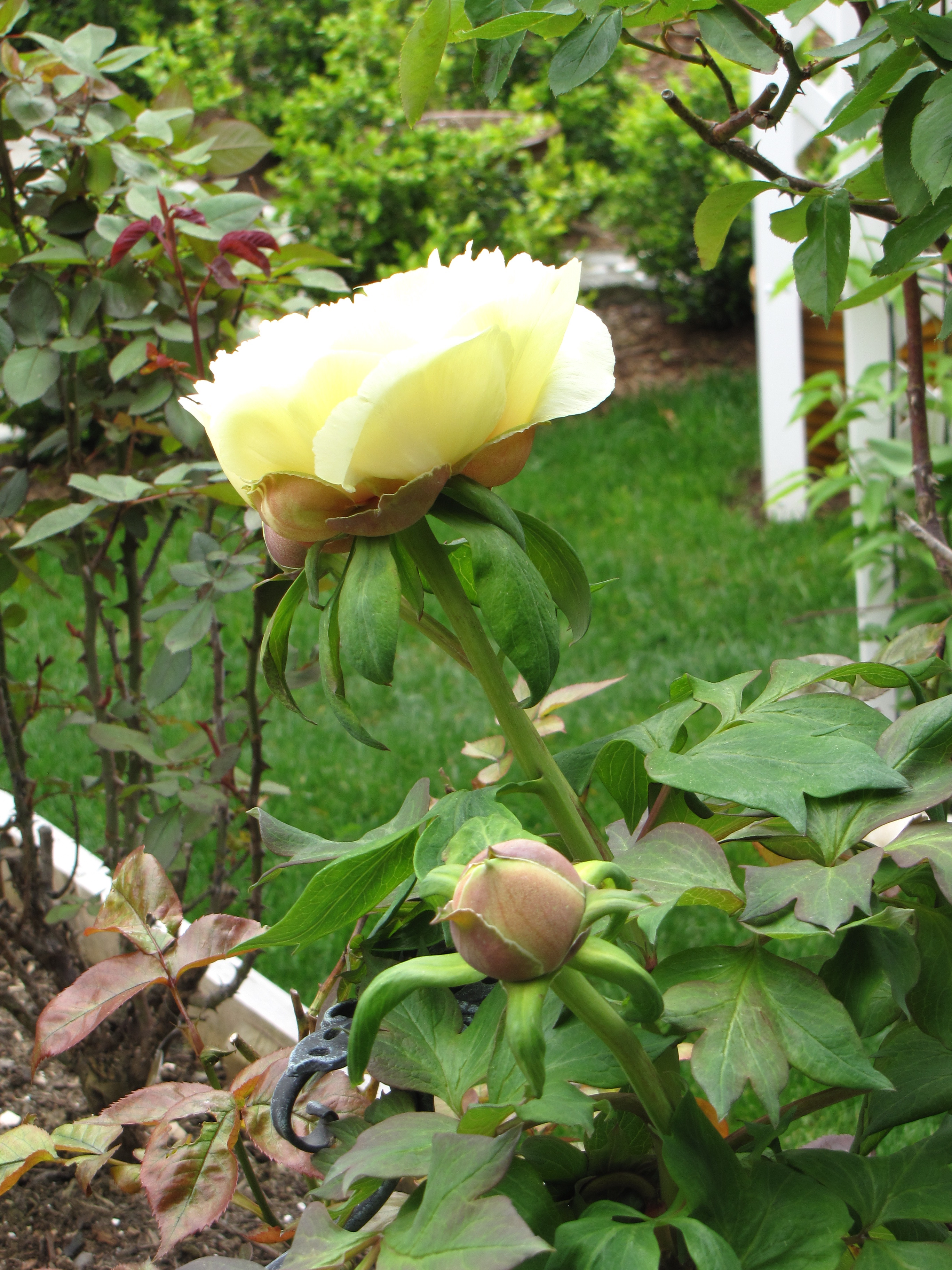 My yellow tree peony has decided to bloom after 9 years of nothing but foliage! I bought it from a mail order catalogue about 10 years ago and until this week in that time I had one bloom! It was almost left behind when I dug up plants to bring to our Chilliwack, BC garden but tree peonies are expensive to replace so I thought I had better bring it a long. It spent the first summer in a big pot so I could winter it in the garage, it didn’t do much last year so this past spring I thought to heck with it I am planting it in the ground. Now this is no easy feat because we live in a new development and I have seen a few homes being built around my neighbourhood and there is no soil in the backyards! Its all builder’s fill and I mean big rocks and gravel with a skimming of about 8 inches of dirt. In my previous garden I was surprised if I ever found a rock when digging a hole but here you pretty much need dynamite to dig anything decent! So when I plant I remove as many of rocks as I can then using a garden claw I mix in manure, compost and good soil. This is why I am shocked the tree peony not only graced me a giant yellow bloom but there are 6 more coming! This just goes to show no matter how hard we try there is no controlling Mother Nature and plants will do what they want when they want. It was so stormy the other night I thought it would look neurotic if I tried to put an umbrella over the bloom so instead I cut it off and brought it into the house, it opened fully and is almost double the diameter of a tea cup. Sorry, I can’t find the name tag I think its Kinaku or something like that, I will try to find out, enjoy the pictures of it opening up.